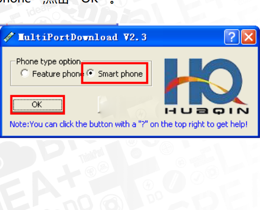 1:把上面下載好的工具解壓後,並打開hq_mtk_customer download_V2.3_140221目錄,然後雙擊【MultiPortDownload.exe】,會彈出如下圖,選擇“Smart phone”,點擊“OK”。