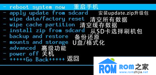 第八步:如果需要手動進入recovery,先將手機徹底的關機,然後同時按住手機的音量鍵上鍵和電源鍵,過一會震動後松開電源鍵就會進入如下圖的recovery界面了。