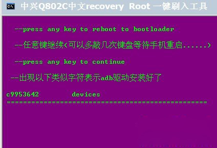 第六步:如果此時驅動安裝好了,會出現一下數字和英文字符的組合字符,然後再按任意鍵繼續開始刷入recovery了,如下圖: