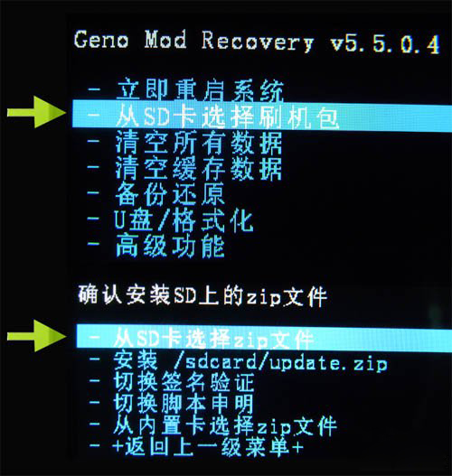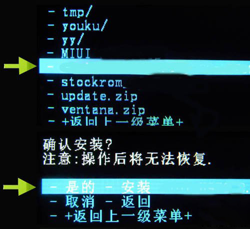 5、返回主界面,按音量鍵選擇【從SD卡選擇刷機包】然後再選擇【從sd卡選擇zip文件】,然後找到剛才復制到手機sd卡根目錄下的zip格式的rom刷機包(比如:XXXXXX.zip),然後再選擇【是的-安裝 XXXXX.zip】,按電源鍵確認。