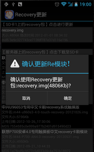 6、如果您已經將recovery.img復制到了TF卡上,並且將TF卡放到了手機上,那麼,此時軟件列表最上面應該會顯示“SD卡上的recovery包”“點擊進行更新”的字樣。