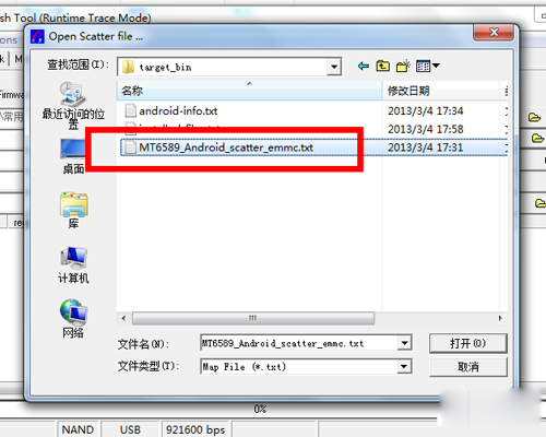 6、然後在剛才解壓出來的target_bin文件夾中選擇MT6589_Android_scatter_emmc.txt(注意:這個文件的名字不同的固件有所不同)。