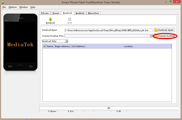 2、點刷機工具的“Scatter-loading”選取“飛利浦W3509官方線刷刷機包”文件夾下的MT6572_Android_scatter.txt文件。