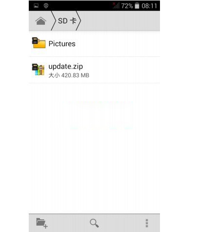 1:將如上下載好的固件包解壓,把解壓得到的“update.zip”文件並放置在 SD 卡根目錄下。 如何放進SD卡中有很多方法,大家可以使用讀卡器,數據線連接電腦打開USB存儲,手機助手等工具上傳至手機中; 放好後可以至手機的文件管理器中查看到,如下圖: