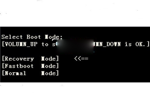 2:文件放好之後,確保放好文件的SD卡安裝在手機中之後,把手機關機,在關機狀態下,一直長按音量上鍵和開機鍵鍵不放,即可進入如下圖所示的界面,在下圖選擇“ Recovery” 模式,再按音量下鍵確認。