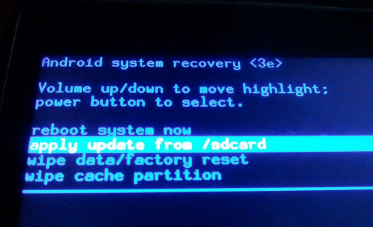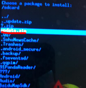 2、我們選擇【apply update from /sdcard】此項的意思就是從SD卡讀取升級(Recovery模式下使用音量鍵移動,電源鍵確認);然後找到我們事先放在SD卡內的【update.zip】文件,如圖: