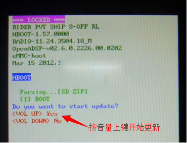 5:然後會自動讀取你的ruu,並提示你是否刷入,按音量上鍵 確認刷入。