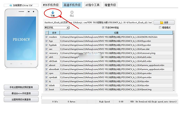 5、選擇【高通手機升級】,選擇“PD1304CV_A_1.18.4”或“PD1304CV_B_2.2.1”文件夾裡的:fastboot_flash_all.bat。