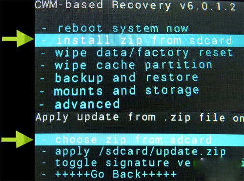3、選擇"install zip from sdcard"並確認,選擇"choose zip from sdcard"並確認,選擇剛才拷到SD卡中的zip格式的ROM刷機包並確認。選擇"Yes - install XXXXXXXXXXXX.zip "並確認。