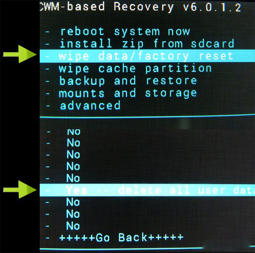 選擇"wipe data/factory reset"並確認,選擇"Yes -- delete all user data"並確認