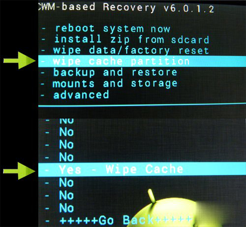 選擇"wipe cache partition"並確認,選擇"Yes--wipe Cache"並確認,操作完成後,回到Recovery模式主界面