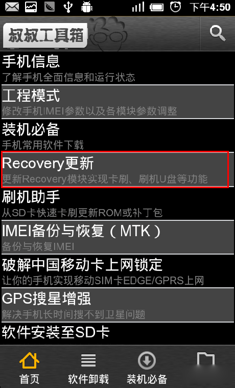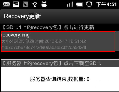 5、然後點擊【recovery更新】這一項,點擊之後會自動查找剛才放到sd卡的recovery文件。