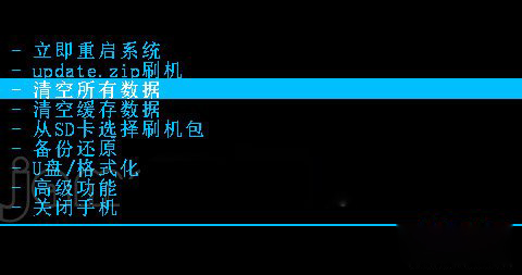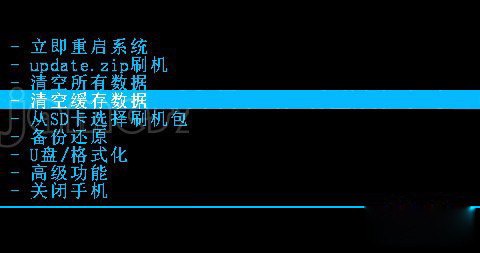 4:返回到recovery主界面,然後用音量鍵選擇【清空緩存數據】,然後再選擇【是的-清空所有緩存】然後按電源鍵確認。