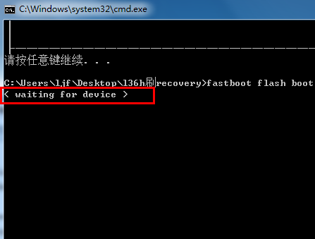 5、如果出現【waitting for device】,說明數據線沒有連接好電腦,或著是電腦上沒有安裝驅動造成的,可以考慮換一個usb插口或重啟電腦。