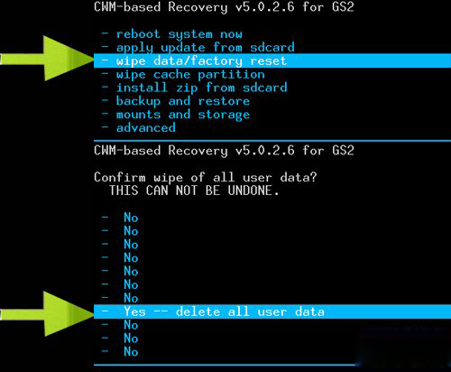 按音量鍵選擇 Wipe DATA/Factory reset 並確認 Yes -- delete all user data