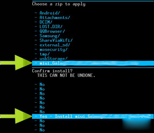 4:然後按音量鍵選擇install zip from sdcard,SD卡選擇choose zip from sdcard,找到你剛才的拷貝進去的zip格式的刷機包文件,並確認YES,,就開始刷了,如果是內置卡選擇choose zip from internal sdcard,找到你剛才的拷貝進去的zip文件,並確認YES,,就開始刷了。