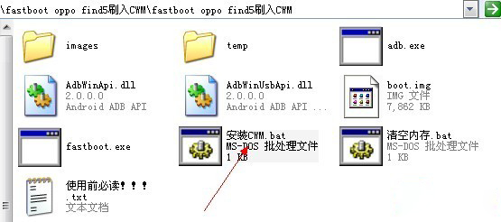 3、手機屏幕上應當顯示"已經進入fastboot"(如果沒有顯示請檢查前面幾步操作),解壓縮recovery刷入工具,在文件夾裡面找到安裝CWM.bat,如下圖所示: