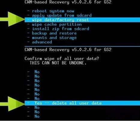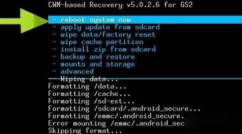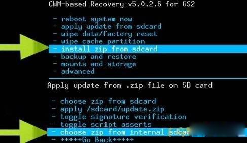 (RECOVERY版本不一樣可能圖片也不一樣,只需要選擇對應的選項即可,下圖只是以CWM Recovery v5.0.2.6 for GS2為例)