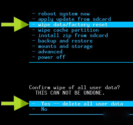 wipe data/factory reset(清空所有數據)——Yes——delete all user data(是的-清空所有數據)