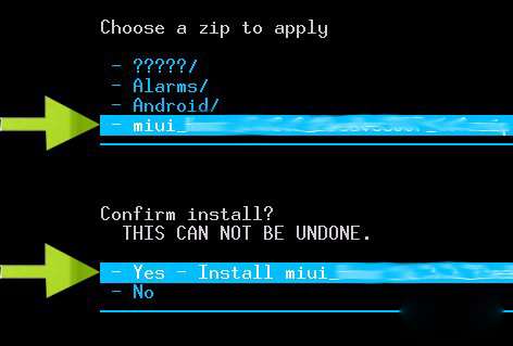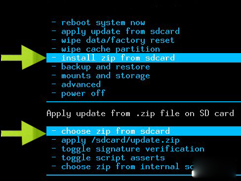 4:接下來就是開始刷入zip格式的刷機包了,按音量鍵選擇install zip from sdcard(從SD卡選擇刷機包),確認,然後再按音量鍵選擇 choose zip from sdcard(從SD卡上選擇zip文件),然後確認,接下來按音量鍵移動光標找到之前放入SD卡根目錄的刷機包,然後選擇Yes – Install XXXXX.zip(是的 - 安裝XXX),確認開始刷機。