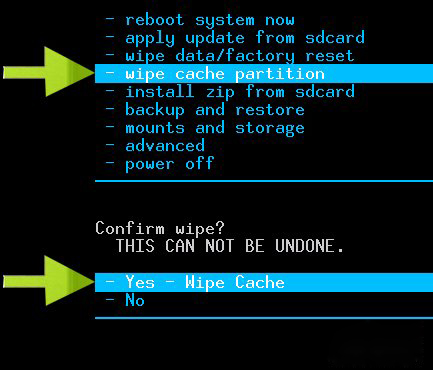 wipe cache partition(清空所有緩存)——Yes-Wipe Cache(是的-清空所有緩存)