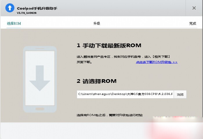 1、 下載"酷派5313S官方CPB",解壓文件,打開安裝好的升級工具(Coolpad Download Assistant),點擊"浏覽",選擇酷派5313S官方CPB解壓後的"4.4.007.P1.150126.5313S.CPB"文件,然後選擇"升級包校驗"。