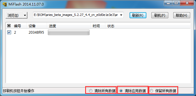 5、可以根據需要選擇【清除所有數據】(此操作會清除所有數據,包括格式化內存卡)、【清除應用數據】(軟件默認,等效雙清恢復出廠設置,會清除手機安裝軟件、聯系人等資料)、【保留所有應用】(不建議操作,刷機後可能會產生諸多未知Bug)(99%情況可以跳過此步驟)。