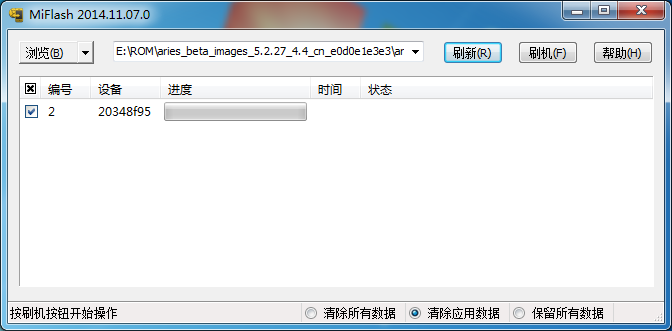 4、 將復制的目錄粘貼到如圖藍色圖標位置,然後按刷新,刷機程序會自動識別顯示你連接的小米手機。