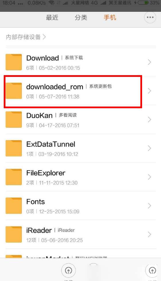 2、然後將zip格式的刷機包拷貝至“內置存儲 /downloaded_rom”文件夾下。
