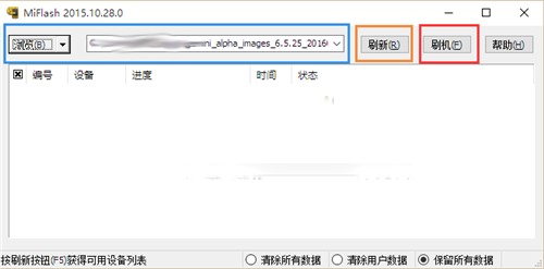 4、在桌面上找到“MiFlash”圖標,雙擊打開,將復制的內容粘貼到藍色區域位置。點擊橙色圈選部分刷新,刷機程序會自動識別手機,刷機模式選擇“清除所有數據”,點擊紅色圈選部分刷機開始刷機;如圖: