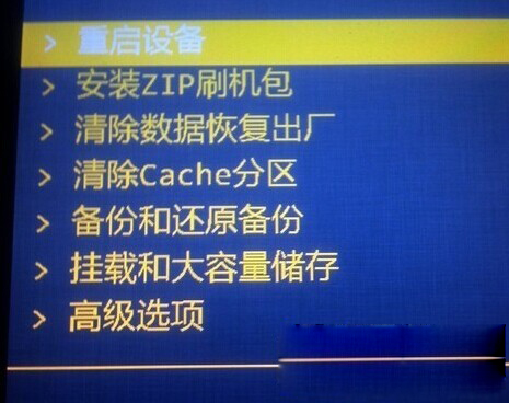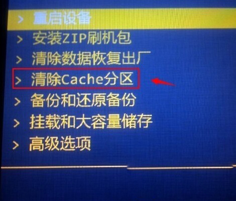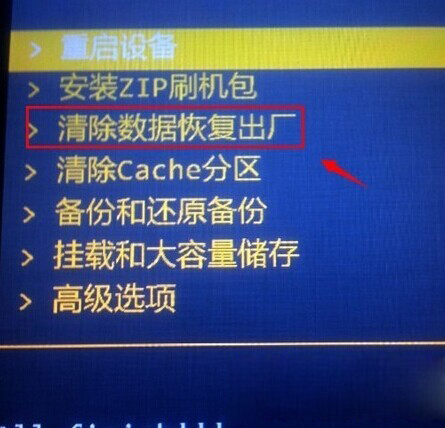 4.進入recovery之後,用音量鍵選擇,分別選擇“清空所有數據(恢復出廠設置)”和“清空緩存cache”,按電源鍵確認。