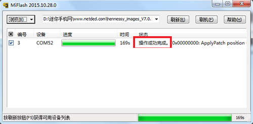 8:線刷時間根據每人電腦不同又長又短,一般不超過200s,過一會界面顯示“操作成功完成”,就表示線刷成功,手機會自動重啟。