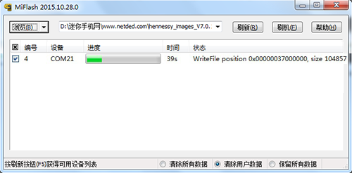 7:然後點擊“刷機”,就開始給手機線刷了,一般情況下前幾秒的時候進度條就已經走了將近一半了,如果沒走的話,可能是會失敗。