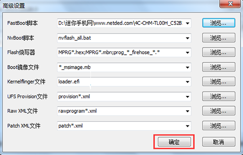 6:然後點擊浏覽按鈕旁邊的小箭頭,選擇高級設置,找到你剛才解壓出來的線刷包的rom文件夾裡的【flash_all_except_data_storage.bat】文件,然後點擊確定。