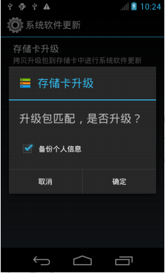 6、選擇“存儲卡升級”,若升級包已經在SD卡的根目錄下,點擊升級後會出現提示界面,建議勾選“備份個人信息”選項。