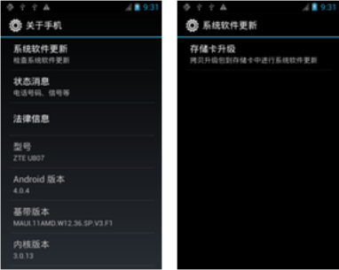 5、在主菜單中選擇“設置”功能,然後進入“關於手機——系統軟件更新——存儲卡升級”。