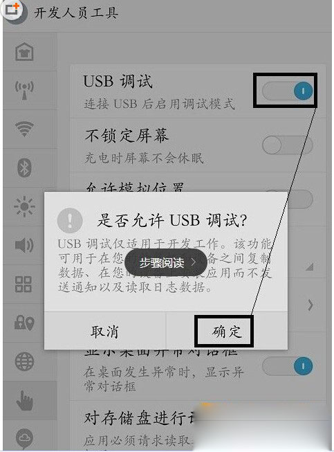 2、然後就能看到USB調試模式了,打開按鈕,點擊確定就可以