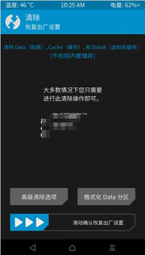 3:刷入ROM前面建議清空用戶數據,即清空data分區下的文件(因此,請實先務必做好重要數據備份工作,比如聯系人、短信、已安裝軟件等,內置存儲中的文件將不會被清除),相當於恢復出廠設置,操作方法是:點擊 “清除”,滑動下方的按鈕 “滑動按鈕開始執行”,很快就完成了該操作,一直點右下角返回箭頭,即可返回 Recovery 主界面。