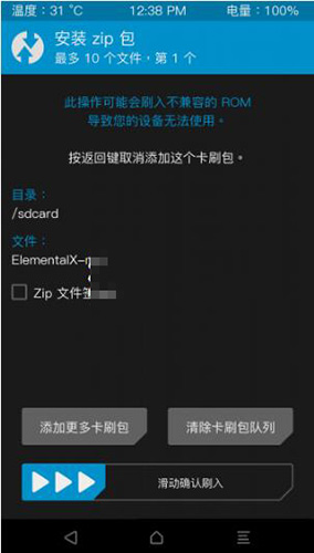 4:清理完成之後返回到recovery主界面,點擊 “安裝”,即可進入系統目錄選取文件。選取“選取存儲器”可以切換內外存儲器,找到剛剛准備好的zip格式rom包,點擊它,然後滑動下方按鈕“滑動確認刷入。