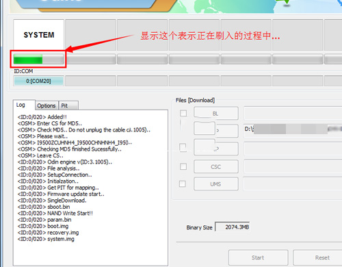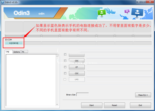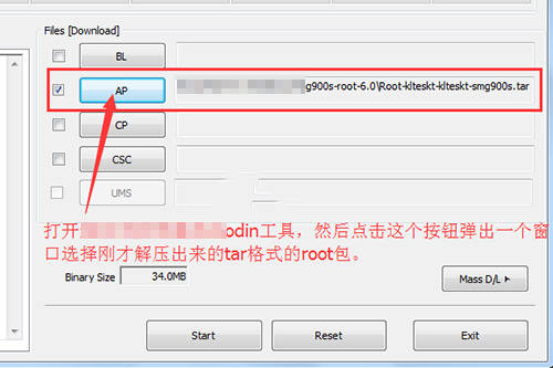 4:打開odin軟件之後軟件會自動識別你的手機,識別成功後會在ID:COM處顯示藍色的(表示手機連接成功了,如果沒有顯示藍色的,說明沒有有連接好),然後勾選AP,選擇上面下載並解壓出來的tar格式的root文件包。