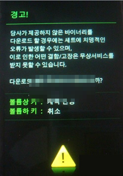 1:手機先完全的關機,然後同時按住手機的音量下鍵 + HOME鍵 + 電源鍵,等待3秒,出現下圖界面: