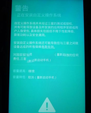 1:手機先完全的關機,然後同時按住手機的音量下鍵 + HOME鍵 + 電源鍵,等待3秒,出現下圖界面: