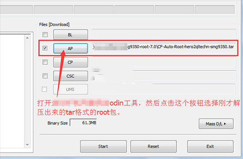 4:打開odin軟件之後軟件會自動識別你的手機,識別成功後會在ID:COM處顯示藍色的(表示手機連接成功了,如果沒有顯示藍色的,說明沒有有連接好),然後勾選AP,選擇上面下載並解壓出來的tar格式的root文件包。