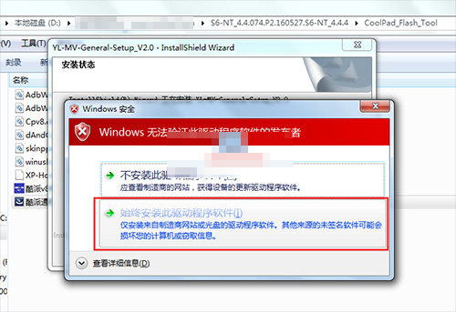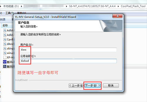 2:進入刷機工具的文件夾裡,然後找到【酷派通用驅動安裝文件.exe】文件直接雙擊打開運行安裝驅動,一直點擊下一步,到填寫信息頁面,隨便輸入幾個數字或者字母,選擇全部點擊下一步,彈出安裝提示,直接點擊始終安裝此驅動程序軟件。