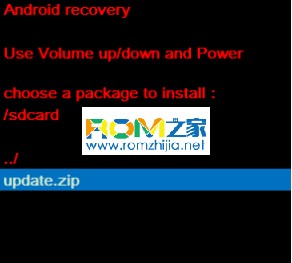 7:然後在出現的列表中選擇 update.zip 文件,然後按開機鍵進行確認,之後就開始刷機了