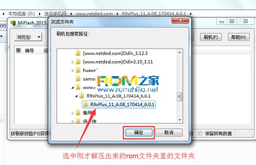 3:然後點擊【浏覽】按鈕,找到選中剛才解壓出來的線刷包的rom文件夾裡的文件夾即可,然後點擊確定