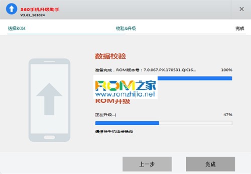 7:刷機工具顯示”正在升級,請保持於手機連接穩定“,直到刷機工具顯示”恭喜您,您的手機已升級完成“(由於刷機等同於重新做系統,所以刷機過程和刷機完成後首次開機時間較長,請耐心等待。);