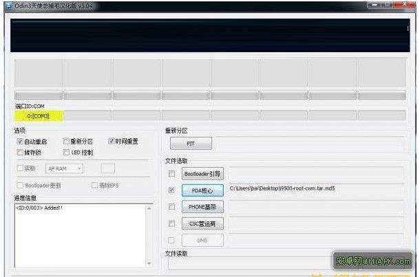 點ODIN上的PDA核心,選上解壓出來的i9500-root-cwm.tar.md5;如下圖所示;