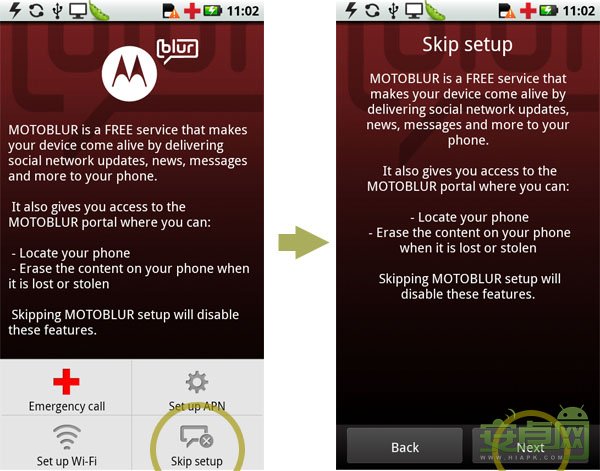 Menu鍵選擇-->skip setup選選擇-->next項進入桌面。