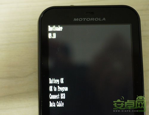 執行本步驟前請先關閉手機,同時按住電源鍵和音量上鍵,此時進入了Bootloader界面。